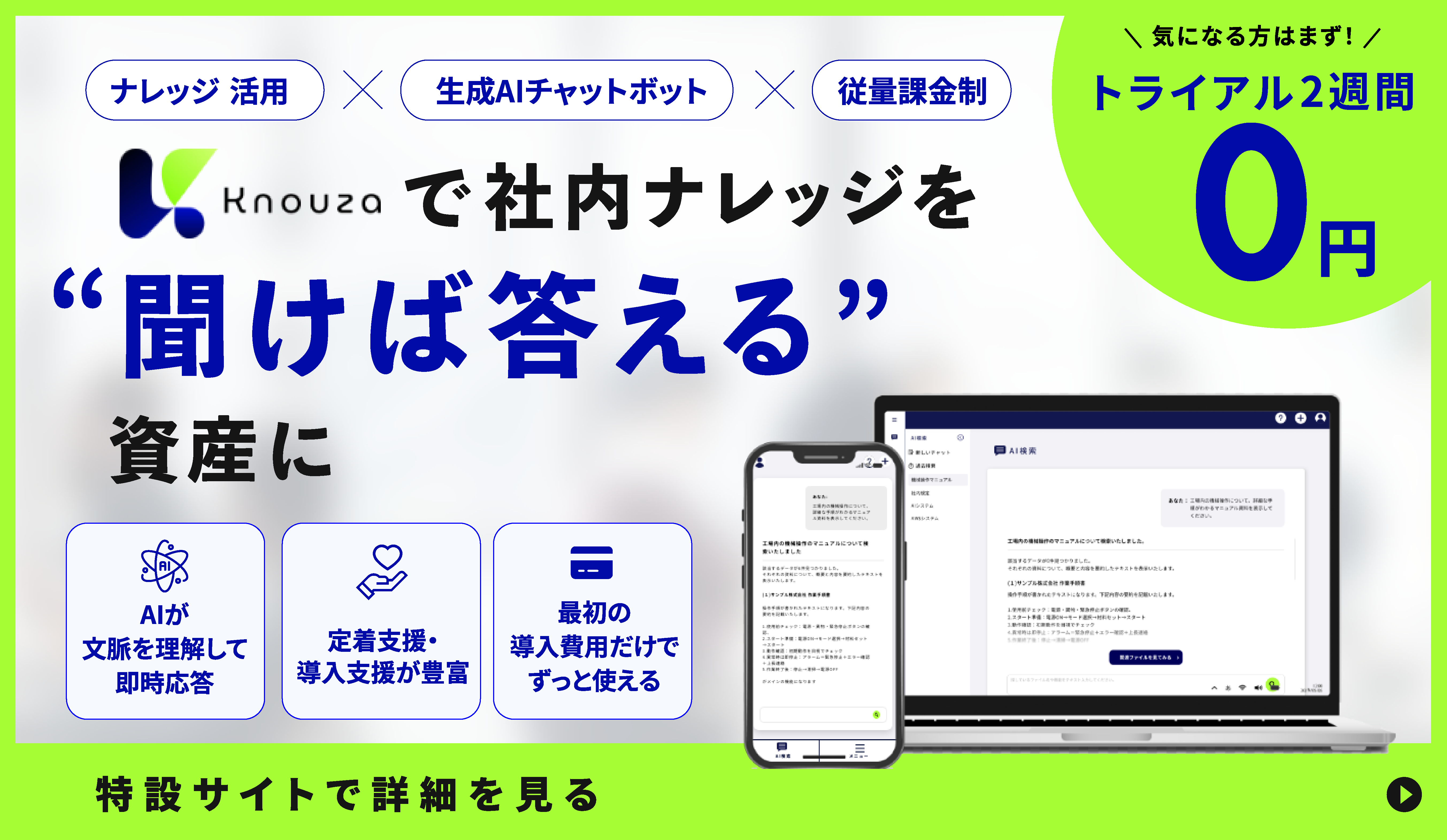 そして、その知識を“誰もが使える資産”に変える第一歩として、KnouzaのようなAI活用型プラットフォームを検討してみてはいかがでしょうか。